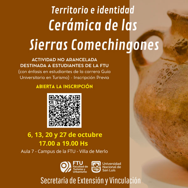 La Secretaría de Extensión y Vinculación de la FTU informa que se llevará acabo el Taller de Capacitación "Territorio e identidad. Cerámica de las Sierras Comechingones” destinado a estudiantes de las carreras de Turismo de la FTU, con énfasis en los estudiantes de la carrera Guía Universitario en Turismo.