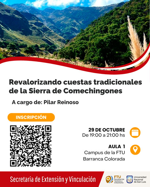 La Secretaría de Extensión Universitaria de la Facultad de Turismo y Urbanismo (FTU) informa que a partir del 29 de octubre se desarrollará el Taller "Revalorizando cuestas tradicionales de la Sierra de Comechingones”, a cargo de la docente Pilar Reinoso. Actividad gratuita. Inscripción previa. Cupos limitados.